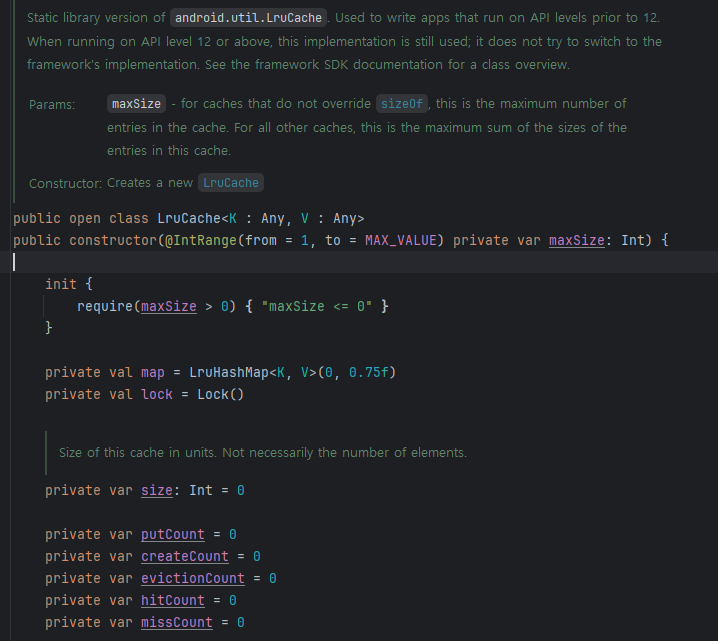 아래와 같이 LruCache<K,V>는 생성자에서 maxSize를 활용해 생성할 수 있다.