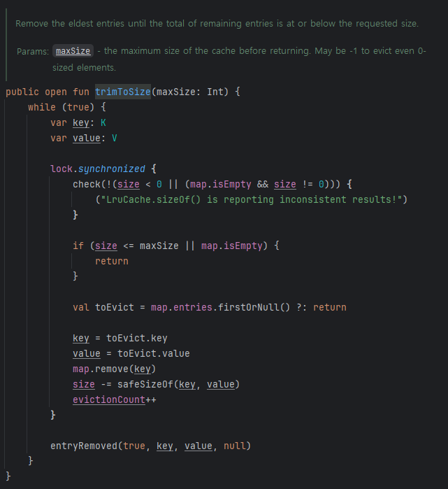 trimToSize는 현재 Cache 사이즈 를 체크한 후, 오래된 데이터를 삭제하는 메서드이다.