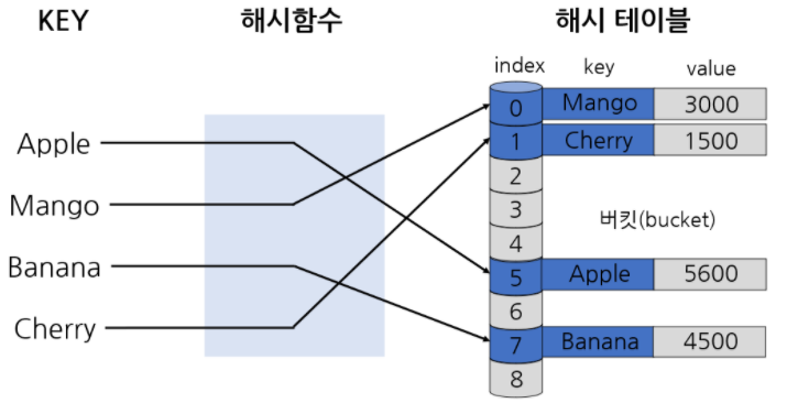 테이블의 크기만큼의 모듈러 연산을 통해 나머지로 해당 인덱스에 저장하게 된다.