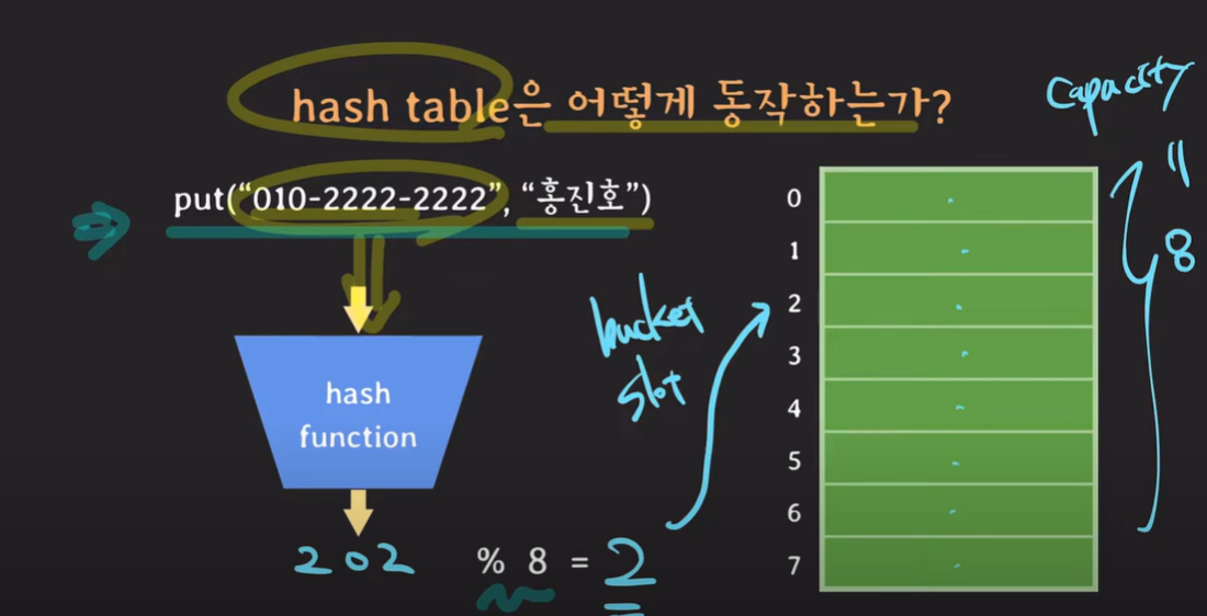 아래의 예시로 추가설명을 하자면 put값을 해시 함수가 일정한 정수로 바꿔준 후 ,