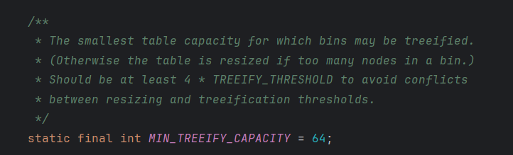 HashMap이 트리화(treeify) 작업을 수행하기 위한 최소 테이블 용량이다.