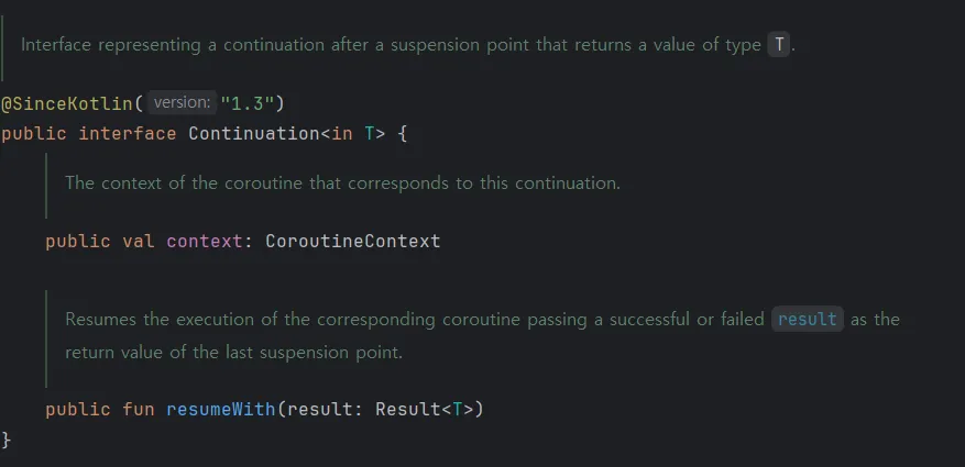 CoroutineContext는 코루틴이 실행되는 환경 및 문맥을 말하며, 현재 실행되는 코루틴의 상태 정보를 담고 있다. resumeWith는 특정 함수 a가 suspend 되어야 할 때, 현재 함수에서 a의 결과 값을 T로 받게 해주는 함수이다 (Result).