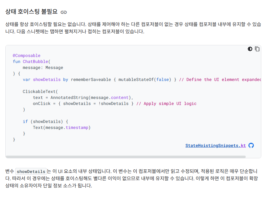 또한 ChatBubble이라는 컴포저블 안에서만 활용되므로, 상태를 호이스팅하여 얻는 이익이 크게 없으므로 내부에 유지해도 된다는 것이다!
