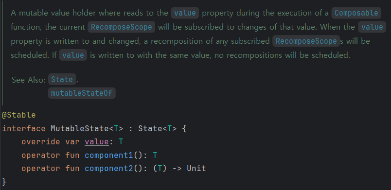- MutableState는 value를 Mutable하게 들고 있고, value 변경 시 Recomposition이 일어난다.