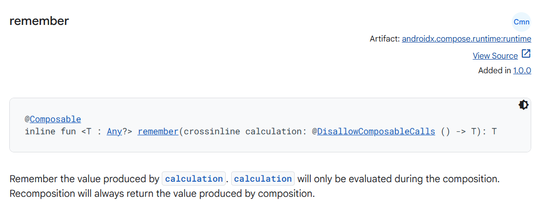 - 이는 컴포저블이 recomposition 되더라도 해당 value를 유지한다는 의미이다