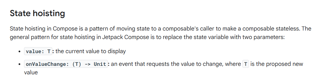 - onValueChange로만 제한되지는 않고 컴포저블에 더 구체적인 이벤트가 어울리는 경우 람다를 사용하여 그 이벤트를 정의해서 사용할 수 있다.