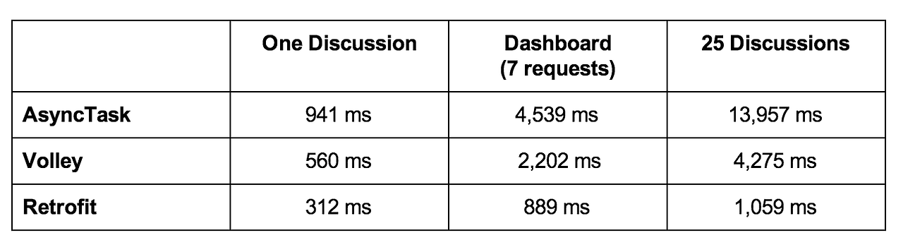 또한 Retrofit은 성능도 뛰어나다. Volley와 AsyncTask와 비교한 표이다.