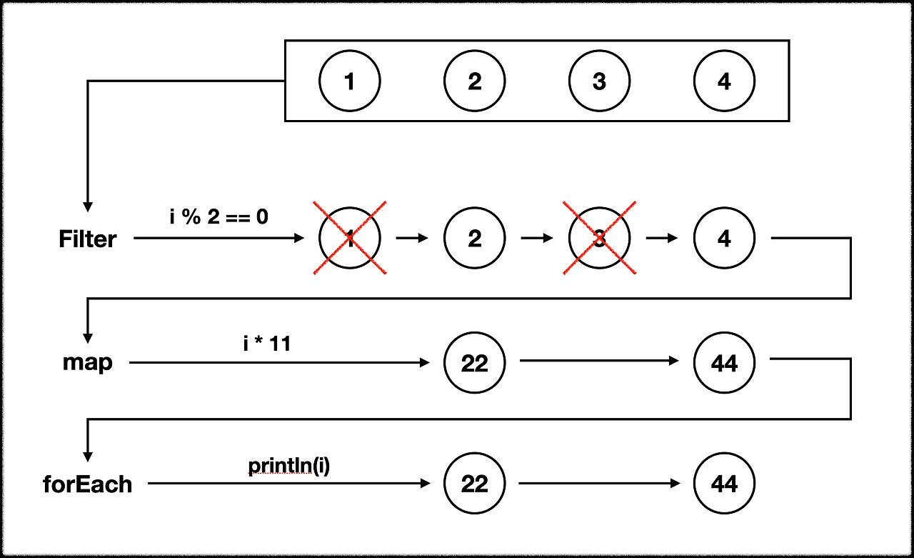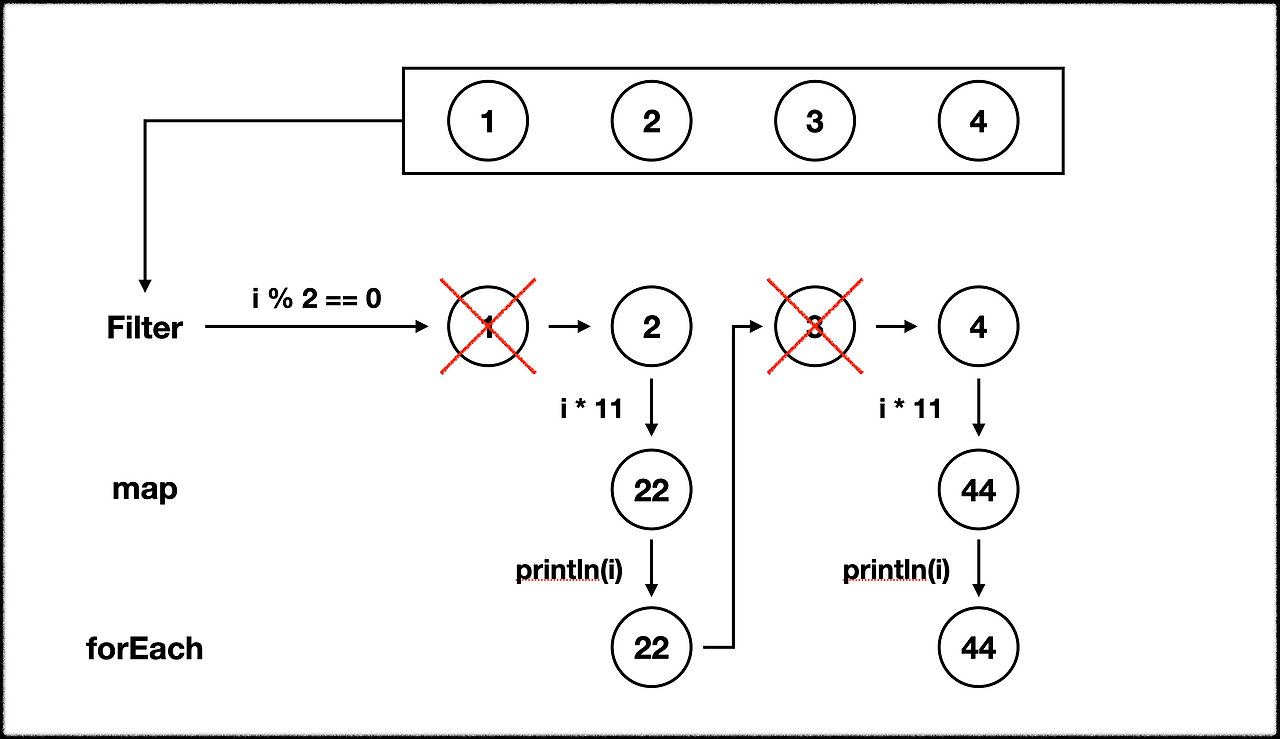 - List와 같은 Iterable은 step-by-step order로 모든 요소에 단계에 처리하는 연산을 적용한 뒤 다음 단계로 넘어간다.