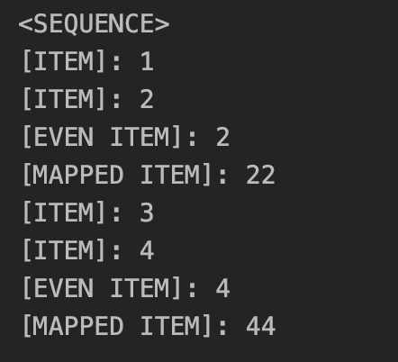.filter { println("[ITEM]: $it"); it % 2 == 0 }