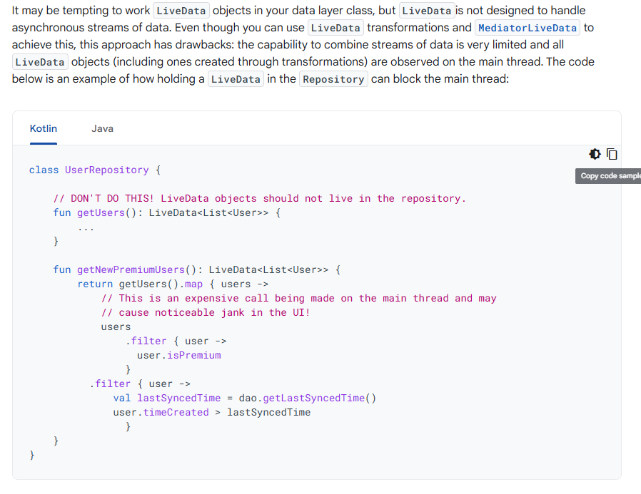 또한 계층별로 모듈화를 한다면 LiveData만을 위해 안드로이드 의존성을 지니게될 수도 있다.