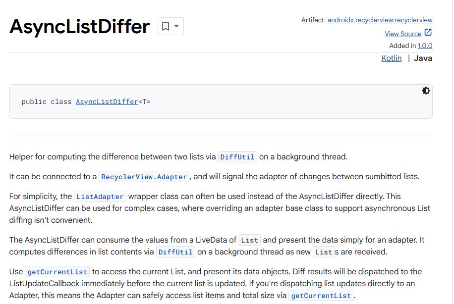 문서의 내용과 같이 AsyncListDiffer 는 새 리스트를 수신받으면, background thread 에서 새 리스트와 기존 리스트 간의 차이점을 계산하고, 연결된 RecyclerView.Adapter 에 어떻게 리스트를 변경하면 되는지 신호를 수신하는 역할을 한다.