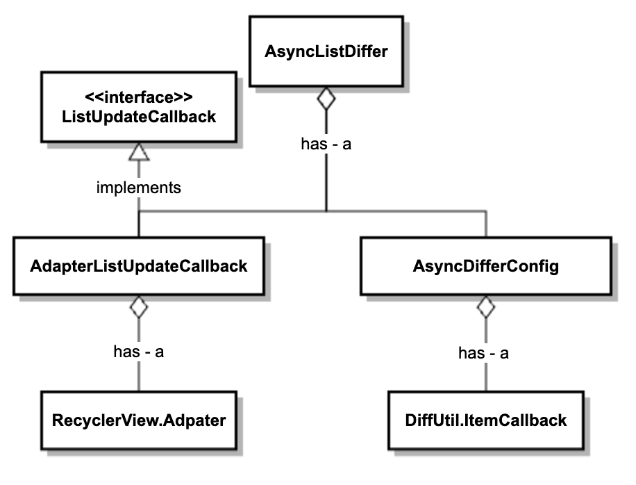 AsnycListDiffer 구조를 보면 AsyncListDiffer 는 RecyclerView.Adapter 와 DiffUtil.ItemCallback 를 포함하고 있는 것을 확인할 수 있다.