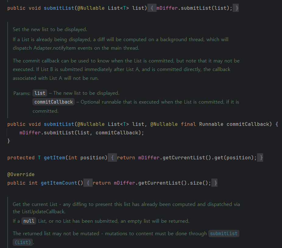 구조만 보면 우리가 정의한 DiffUtil.ItemCallback 의 내용을 참고하여 두 리스트 간의 차이점을 계산하고, 그 결과를 RecyclerView.Adapter 에 전달하는 작업이 진행될 것으로 추측된다.