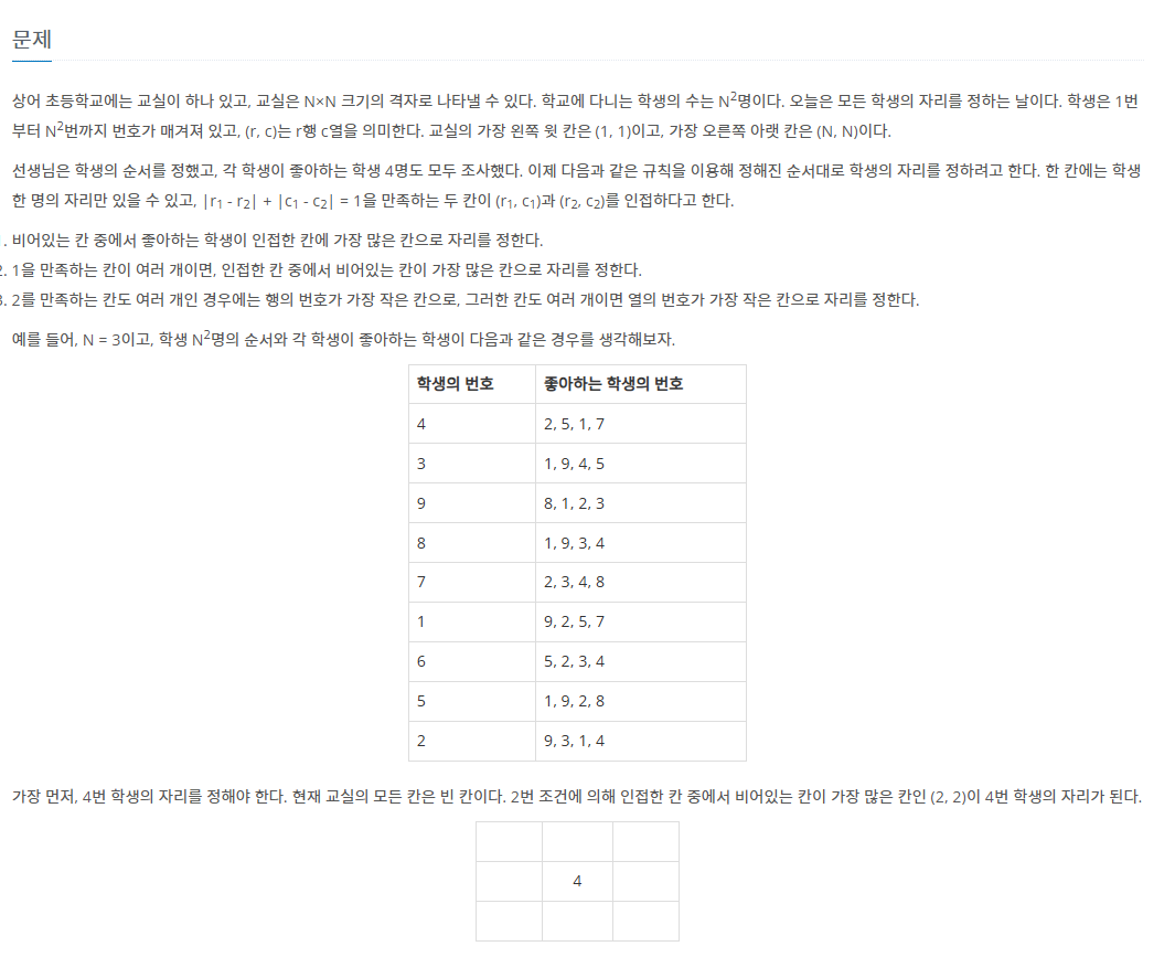 - 주변 네 방향을 확인하여 좋아하는 친구가 가장 많이 있는 자리를 찾는다.